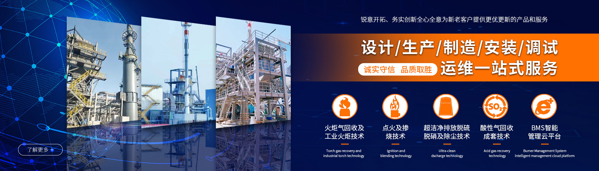 超低氮燃燒技術、 富氧純氧燃燒工程技術、 廢液廢氣焚燒工程技術、 工業廢氣VOCs綜合治理技術、 火炬氣回收及工業火炬技術、 點火及摻燒技術、